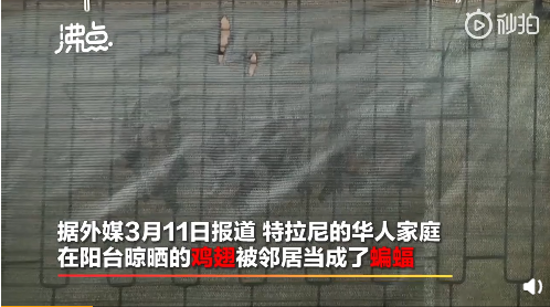 据外媒3月11日报道,在意大利城市特拉尼,一个华人家庭在阳台晾晒的鸡翅被邻居举报,原因是邻居以为是蝙蝠。
