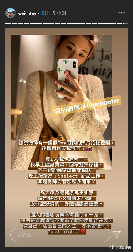 赖弘国前妻在社交网站上写道“听说微博有一个假Ivy用我的照片招摇撞骗,还擅自代表我发言?真Ivy我也很累了…哪还有余力管那么多事?别人的喜怒哀乐不需要你参一脚,特别是冒牌货请不要为了蹭热度刷存在感。做自己、活自己的人生,才不会后悔。”